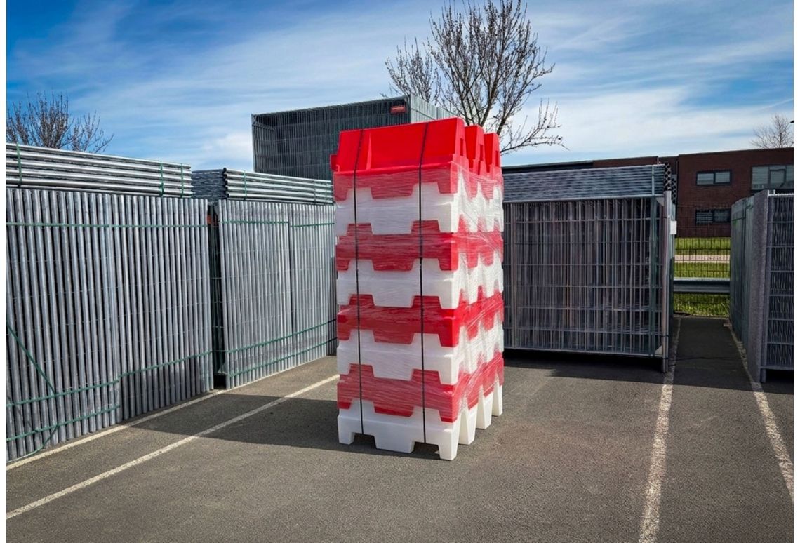 Je kunt deze barriers op nagenoeg elke vlakke ondergrond neerzetten, zoals asfalt, beton of klinkers. Door het brede steunvlak onderop blijven ze stabiel staan en zakken ze niet zomaar weg, zelfs niet op een gestabiliseerde berm of grasveld nadat je ze gevuld hebt.