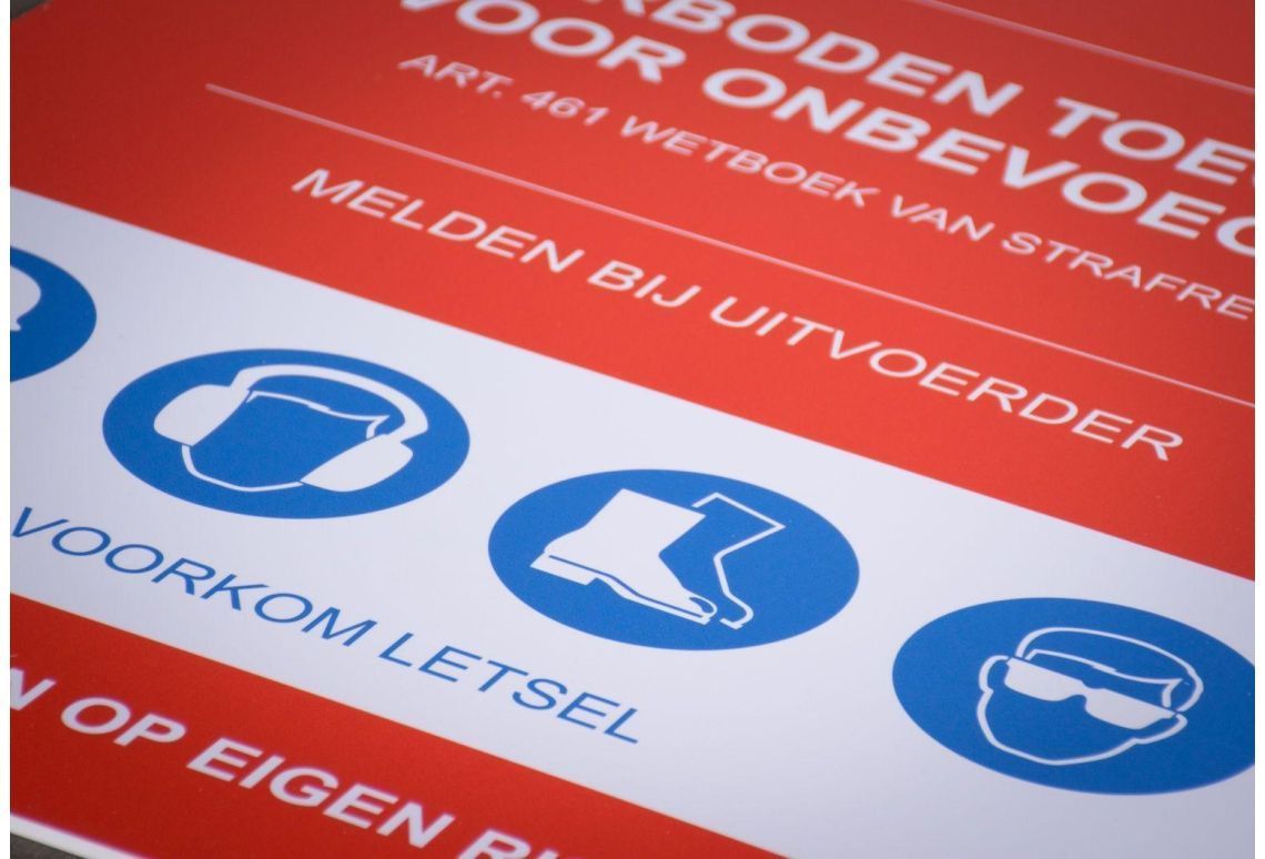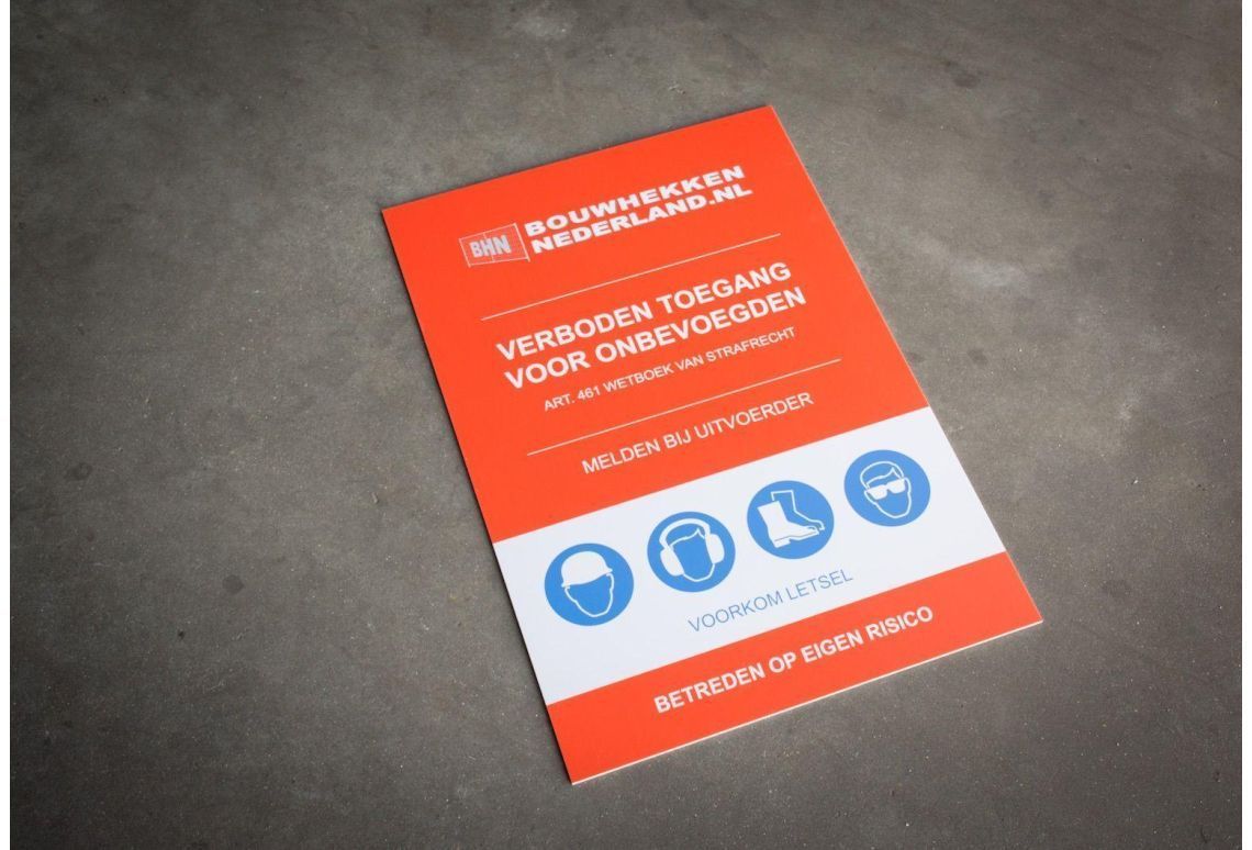 Een standaard bouwplaats bord is praktisch om bezoekers te informeren over de regels. Het bord is 60 cm bij 75 cm en heeft standaard tekst zoals; 'verboden toegang voor onbevoegden', 'melden bij uitvoerder, 'betreden op eigen risico en een verwijzing naar artikel 461 van het wetboek van strafrecht.