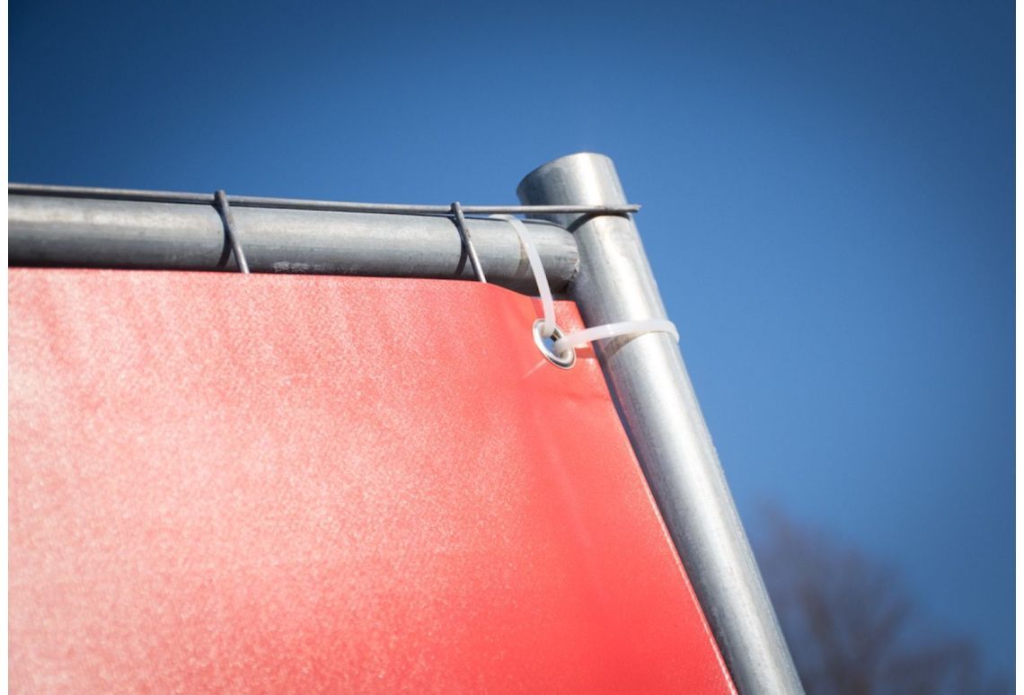 Bevestiging: Gebruik 2 tie wraps door de ringen in de hoeken; één om de horizontale buis en één om de verticale buis van het bouwhek. En zet het doek om de 50 cm met een tie wrap door de ring vast.