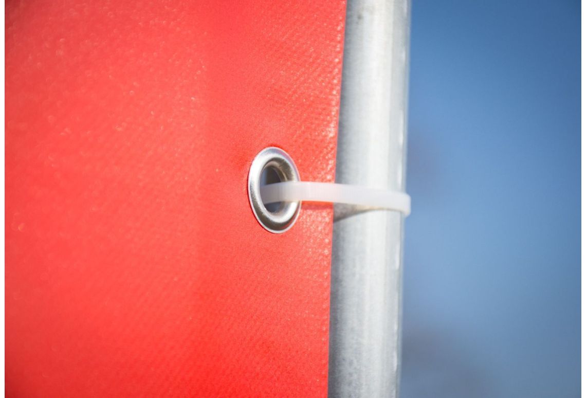Bevestiging: Gebruik 2 tie wraps door de ringen in de hoeken; één om de horizontale buis en één om de verticale buis van het bouwhek. En zet het doek om de 50 cm met een tie wrap door de ring vast.