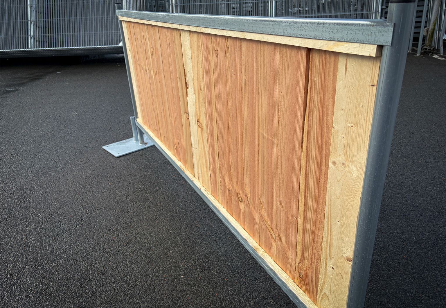 Op de afbeeldingen is de City Fence Wood 1m te zien in combinatie met Voetplaat groot.