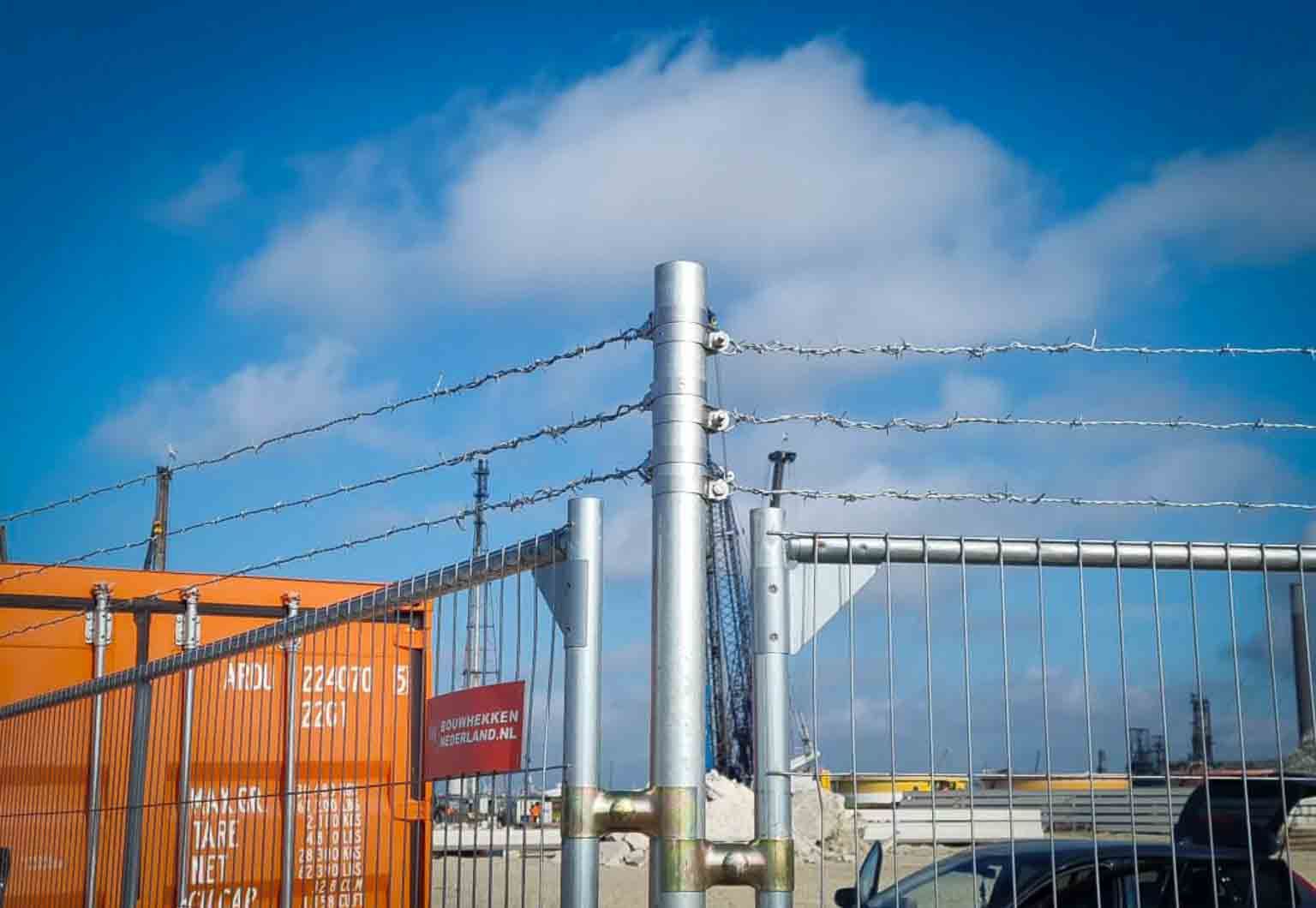 Montage: om 3 rijen prikkeldraad vast te zetten, tussen twee losse buizen van semi-permanent hekwerk, heb je 6x een eindband set nodig.