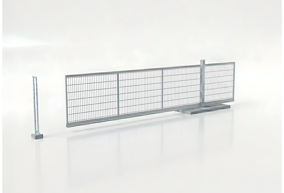 Standaard is deze grote schuifpoort voorzien van een prefab betonfundering waardoor de poort direct kan worden geplaatst en gebruikt. De poort is handmatig te bedienen.