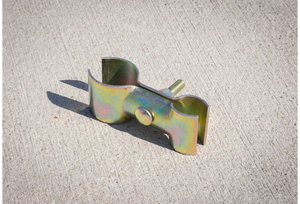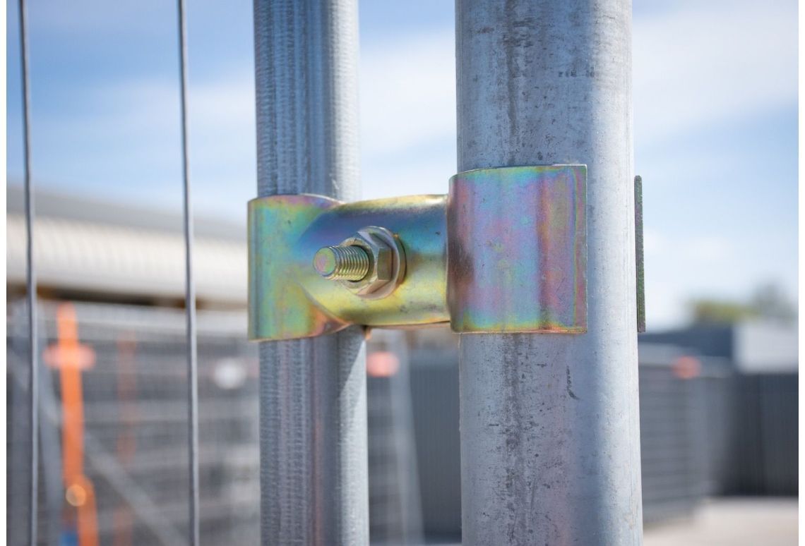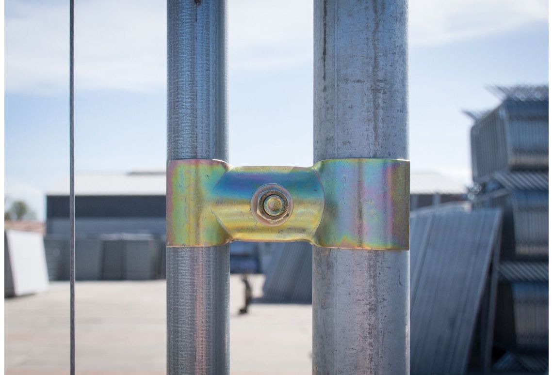 Vervolgens koppel je de bouwhekken aan de losse buis met een bouwhekklem 42/60. Het 42 mm-gedeelte klemt om de staander van het bouwhek, terwijl het 60 mm-gedeelte om de losse buis gaat.