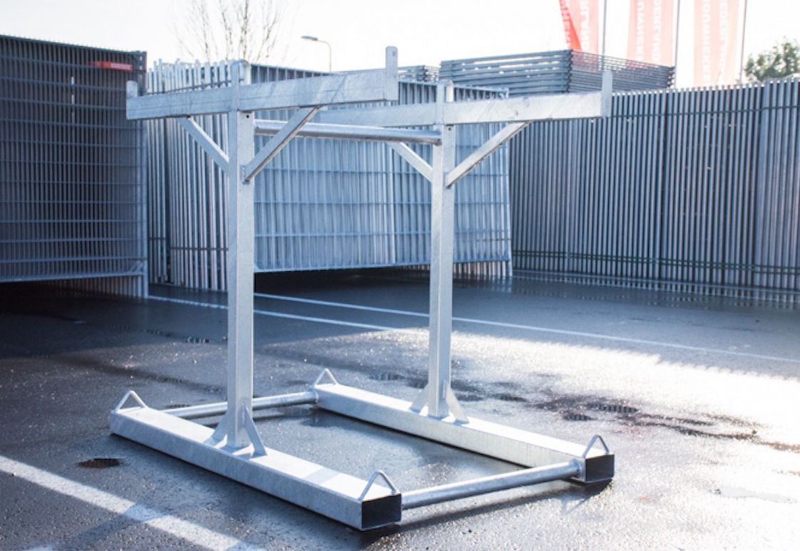 Het laadplatform is stapelbaar en is geschikt voor dranghek 12 spijlen. Het frame is makkelijk op te pakken door de hijsogen en de uitsparingen voor heftrucklepels.