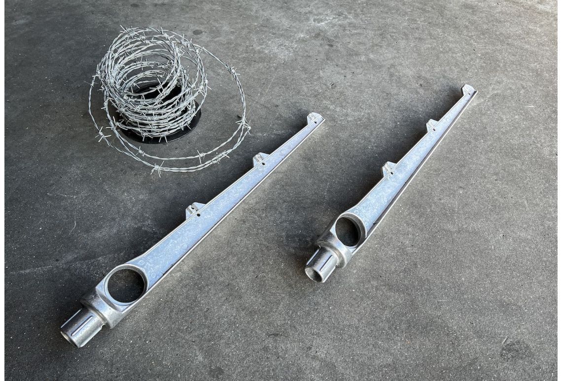 Voor extra terreinbeveiliging is een prikkeldraadextensie een effectieve aanvulling bovenop je tijdelijke hekwerk. Je plaatst deze prikkelhouder bovenin de buis van een bouwhek en bevestigt het prikkeldraad aan de drie daarvoor bestemde punten.