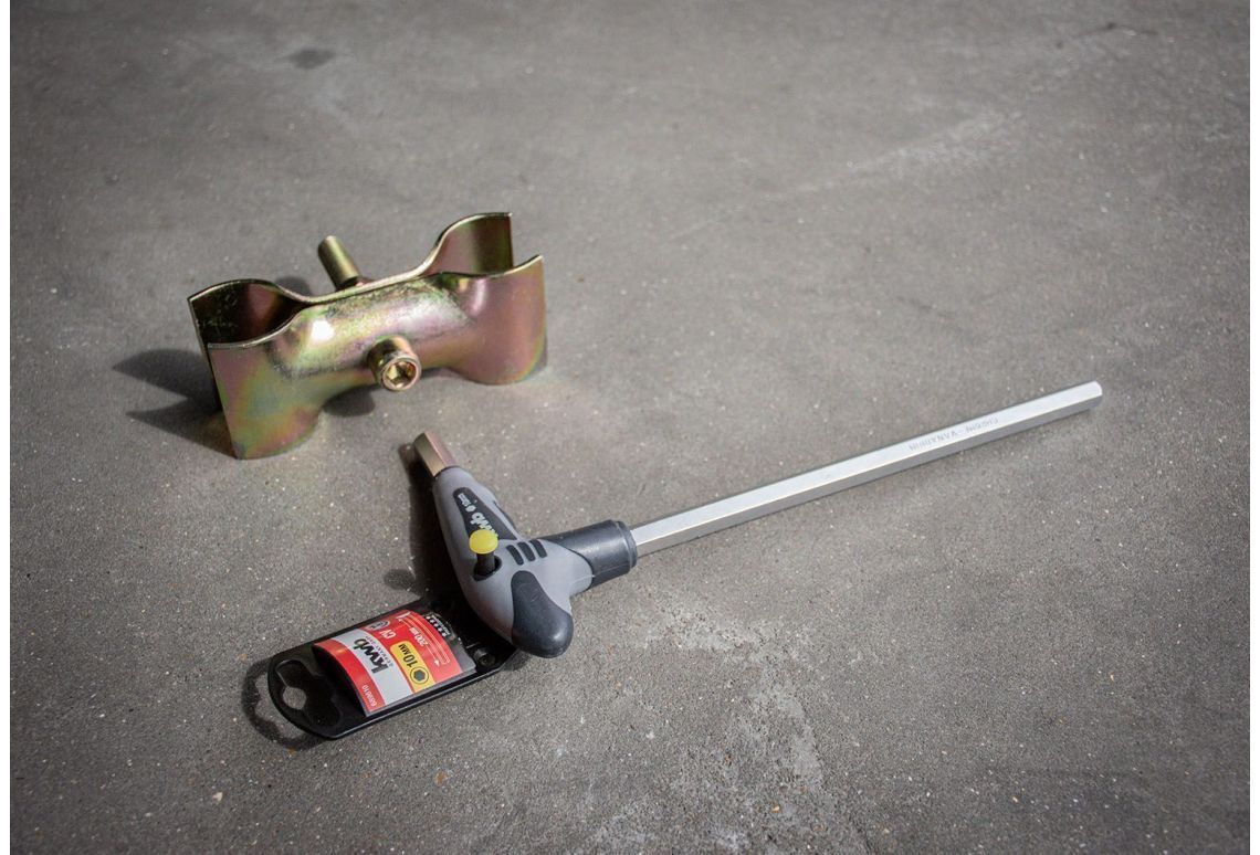 Met de T-greep bouwheksleutel kun je handmatig bouwhek koppelingen met inbus 10mm aandraaien, zoals de standaard koppeling en de koppeling 42/60 mm. Een praktische tool om snel koppelingen vast te zetten tussen de bouwhekken.